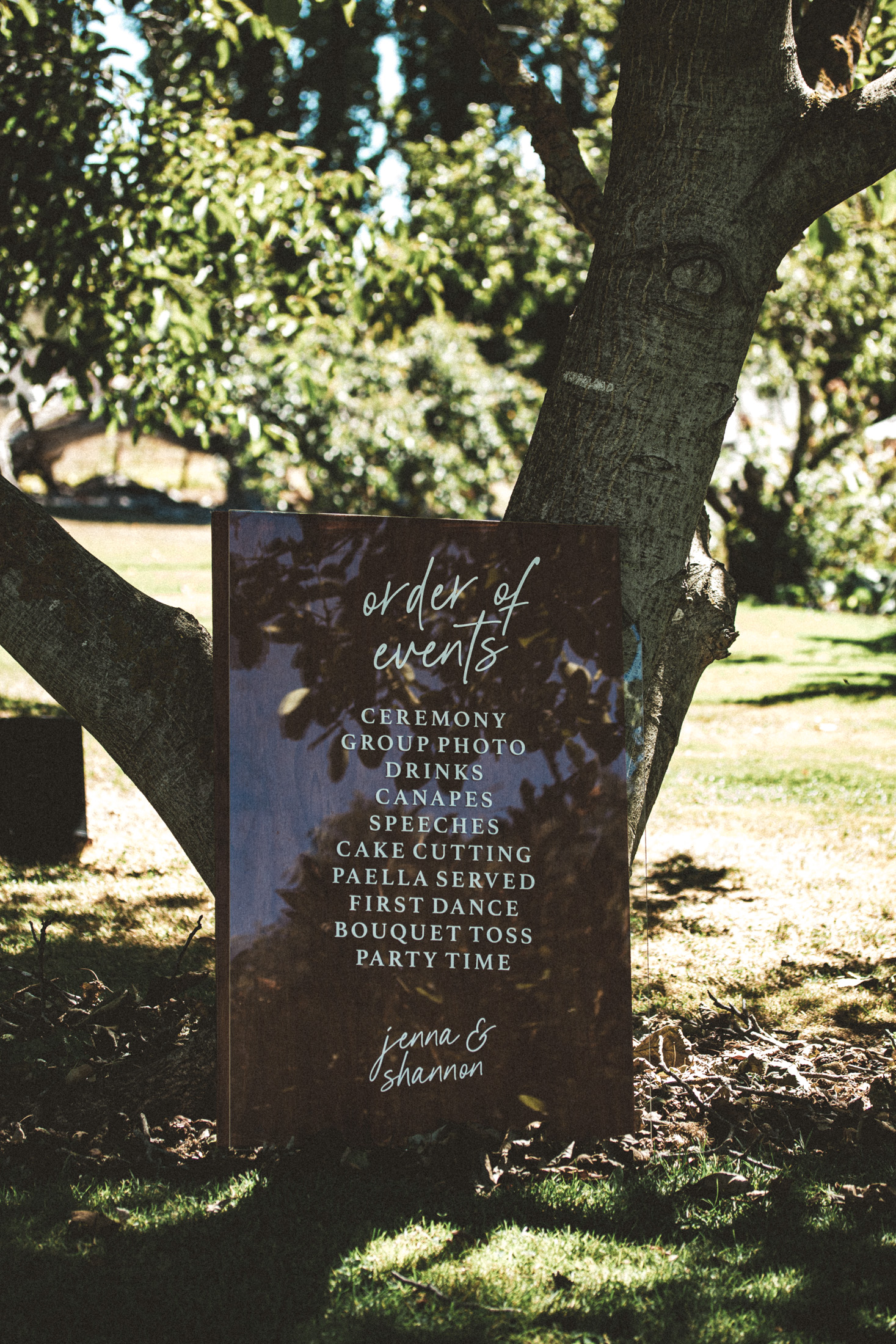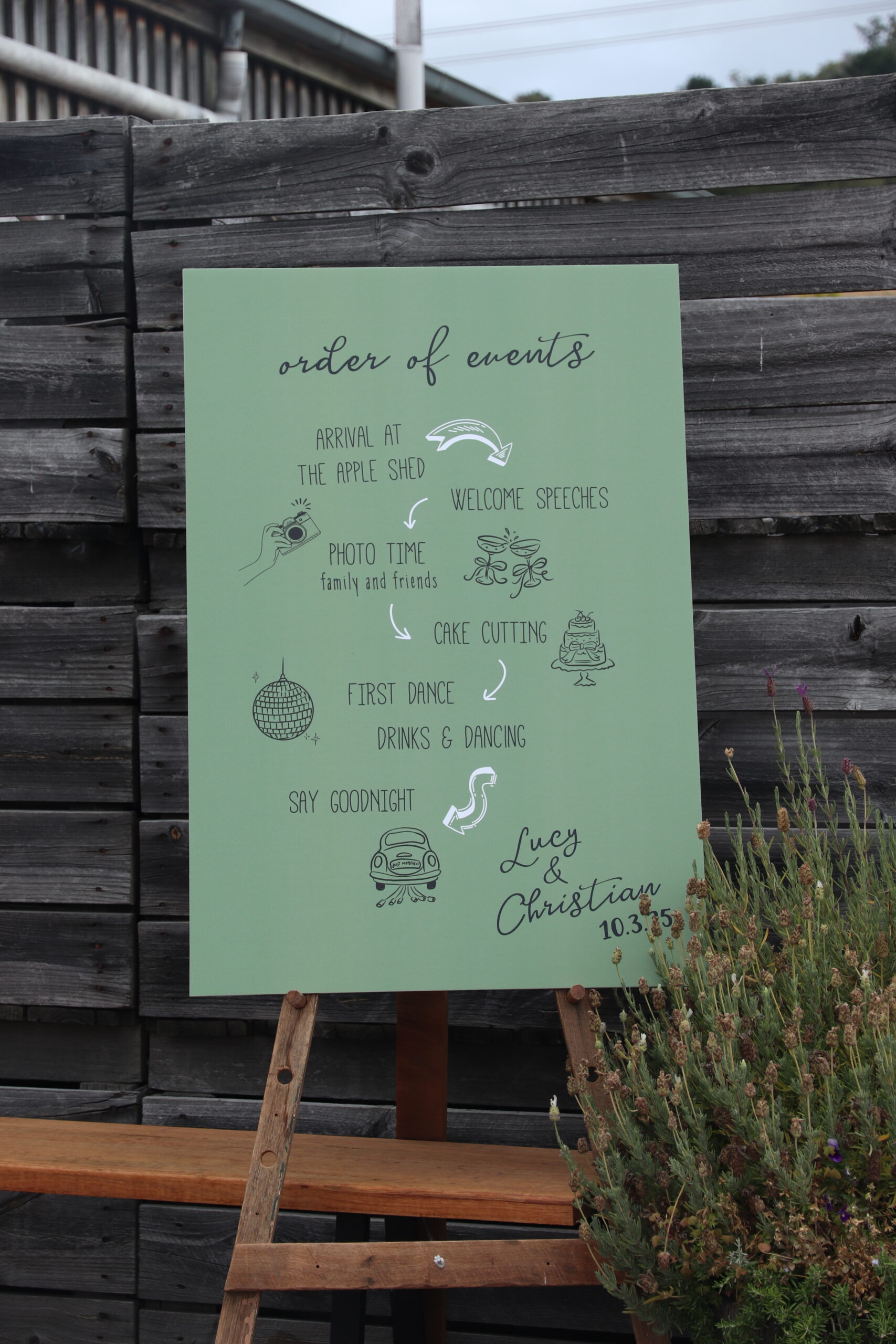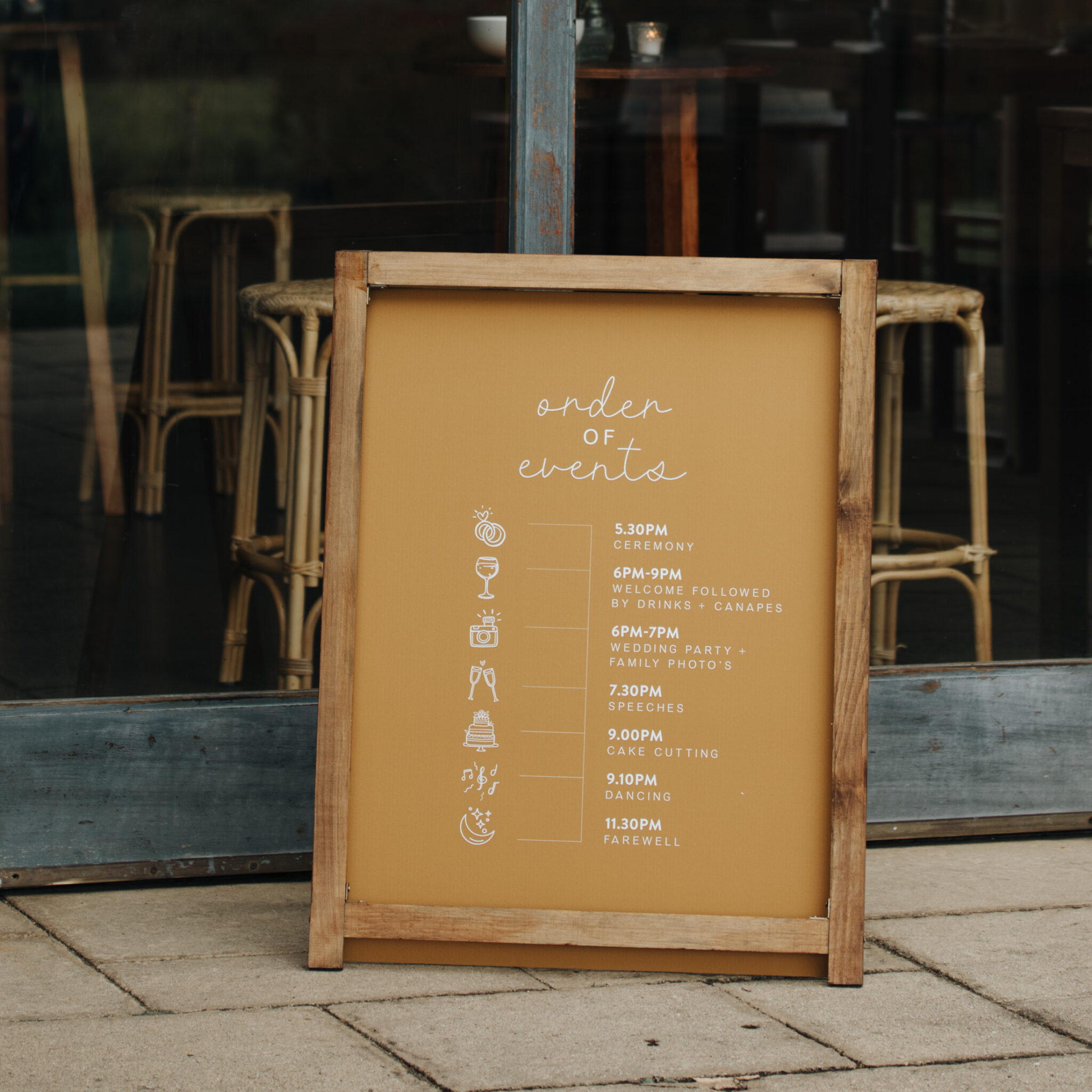 An Order of Events sign instantly shifts the mood. It tells guests, without fuss or formality, “Yes — you’re absolutely at a wedding,” and helps them relax into the celebration.